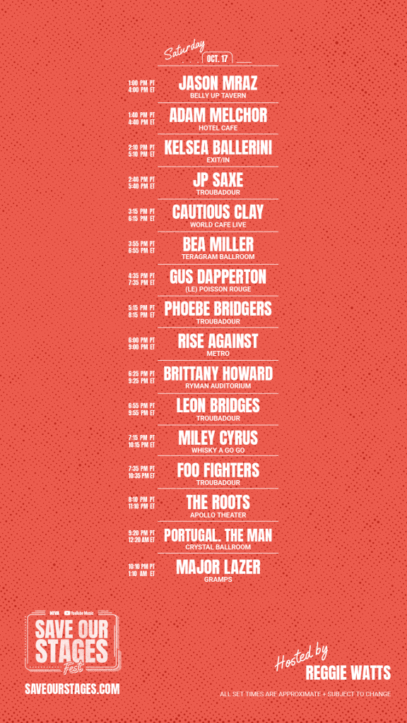 #SOSFEST is a three-day virtual music festival featuring exclusive original performances and content, streaming October 16 -18. Hosted by Reggie Watts, #SOSFEST features performances from 35+ artists, including an intimate set from Foo Fighters, and performances by Leon Bridges, Nathaniel Rateliff, Black Pumas, Miley Cyrus, Kelsea Ballerini, and more, recorded live from more than 25 independent concert venues across the United States.