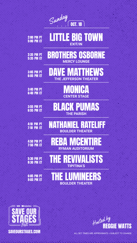 #SOSFEST is a three-day virtual music festival featuring exclusive original performances and content, streaming October 16 -18. Hosted by Reggie Watts, #SOSFEST features performances from 35+ artists, including an intimate set from Foo Fighters, and performances by Leon Bridges, Nathaniel Rateliff, Black Pumas, Miley Cyrus, Kelsea Ballerini, and more, recorded live from more than 25 independent concert venues across the United States.
